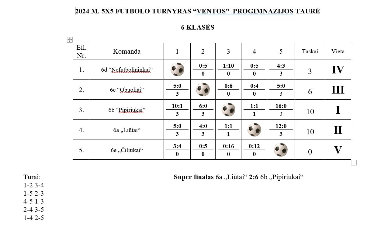 6-ų klasių tarpklasinių futbolo varžybų lentelė
