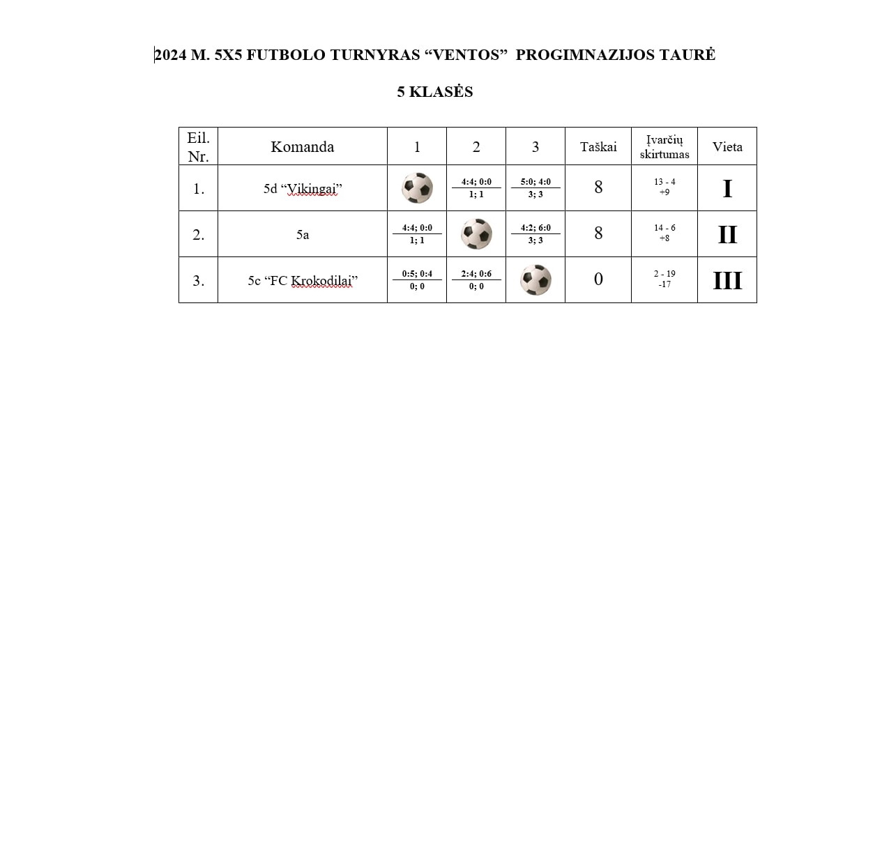 5-ų klasių tarpklasinių futbolo varžybų lentelė